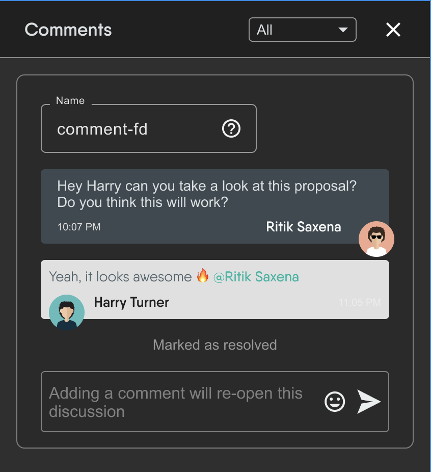 Once the feedback has been addressed, you can mark the comment as resolved. For resolving comments, simply right click on the comment component and select the “resolve” comment action. It closes the comment thread and signifies that the conversation around that feedback has concluded. It helps keep the review process organized and ensures that completed discussions are neatly archived.
